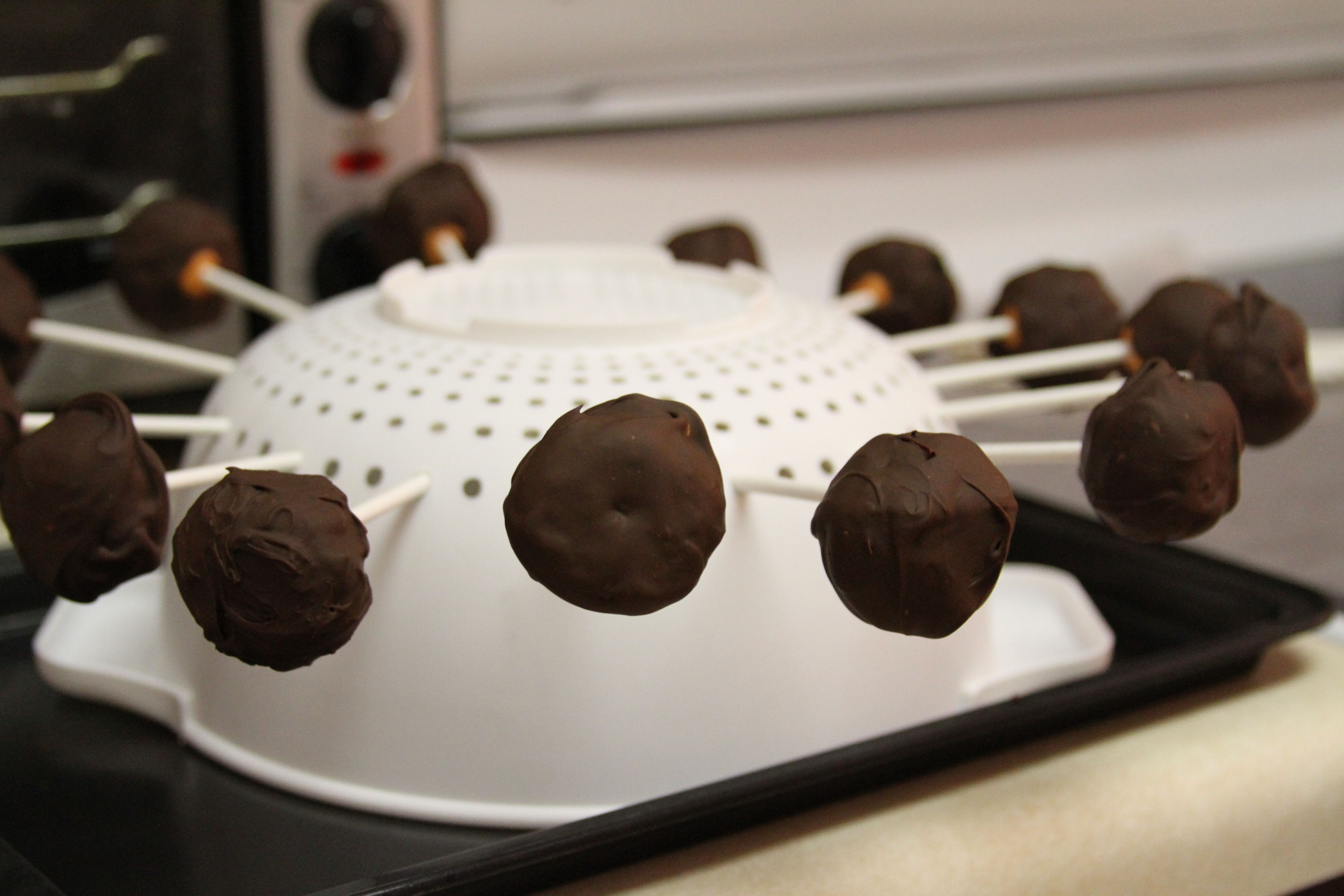 A few hours later, after driving to my sister’s for family dinner, I returned to finish the cake pops. I melted the rest of the orange candy melts and rolled each cake ball until they were completely coated. I thought it was easier to use the back of a spoon to make sure everything was covered instead of trying to actually roll them. If I got a little too much, a few soft taps on the side of the bowl got all the drips off. Then I added a chocolate sprinkle on top for a stem and stuck the pops into styrofoam to let them firm up. The orange candy hardens quickly enough that when the last pop was rolled, I could start painting the first pop.