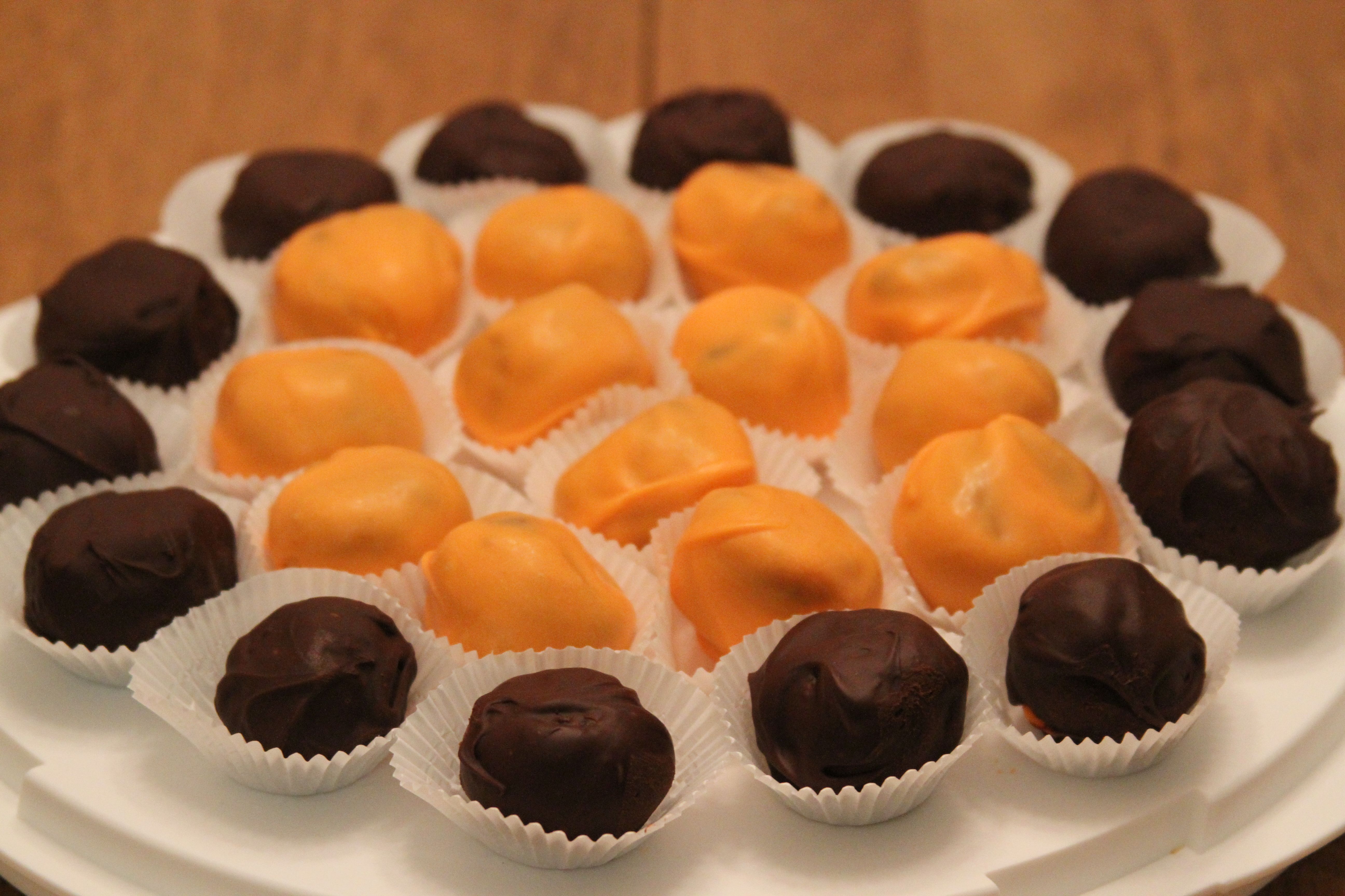 A word about the cake pops. This was our attempt to replicate Bakerella’s famous cake balls on a stick, and as the BF had a pumpkin carving party coming up at his work, I decided to make pumpkins for him. The project took forever – upwards of 4 hours – but they were a HUGE hit. They disappeared so fast, people arriving late at the party were fresh out of luck. So if you have a whole day looking for something to do, try this. But if you need something for your kid’s class party tomorrow morning, just bake some cookies. As always, the recipe below is how we made them, which is not necessarily what the original recipe recommends.