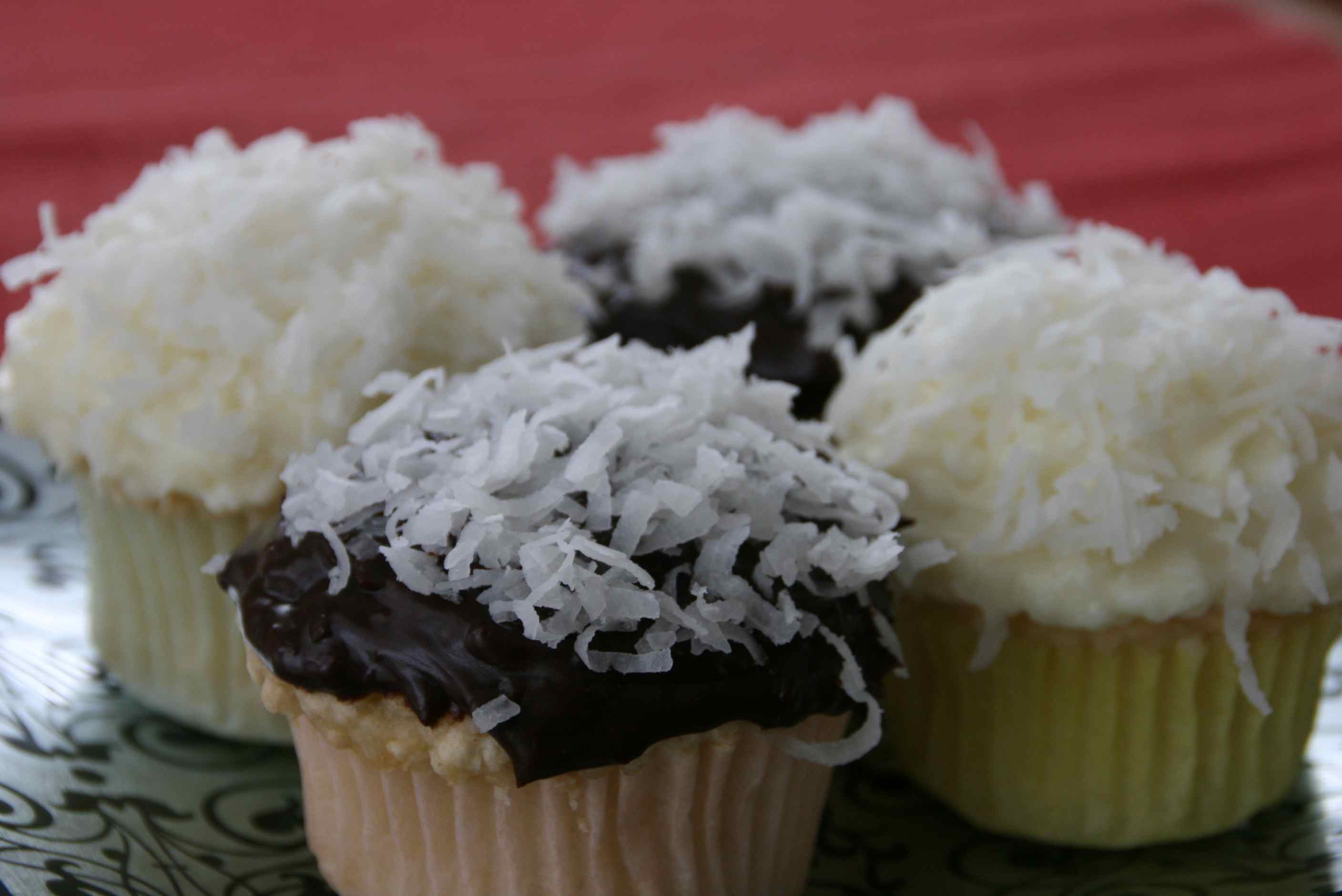 I really like these because the coconut is there, but not too strong. They also looked really cool alternating between black and white cupcakes on display. But frankly — and this may just be the chocoholic in me — the best part of this project was the chocolate frosting.