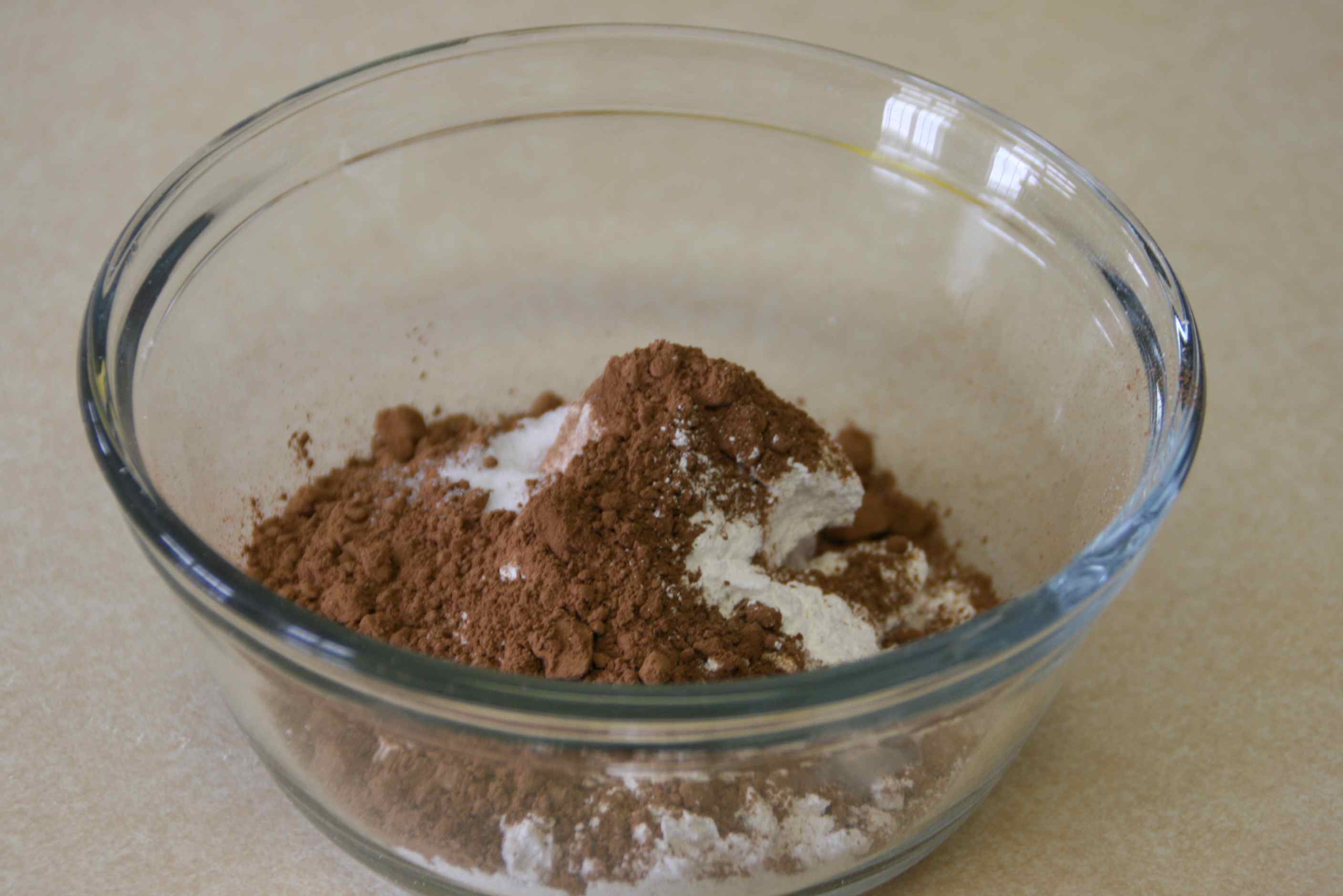 In a medium bowl, I whisked together 3/4 cup all-purpose flour, 1/4 cup cocoa powder, 1/2 teaspoon baking powder, and 1/2 teaspoon salt.