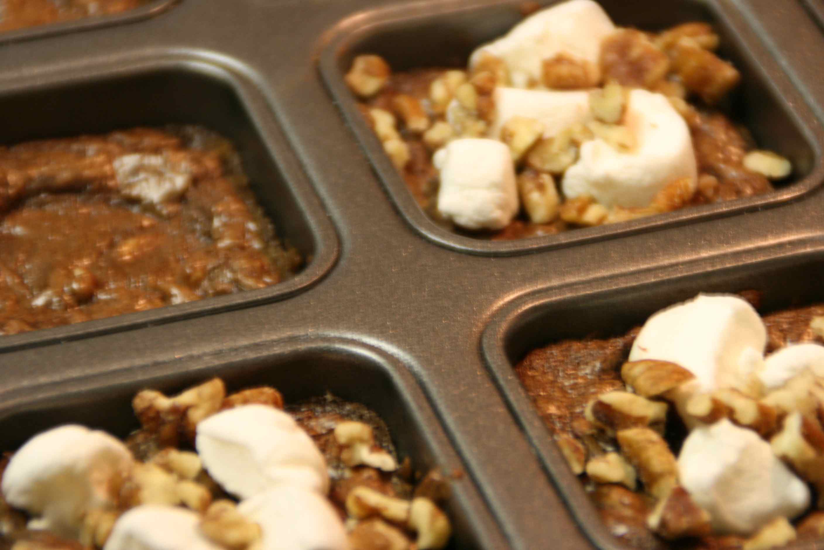 I pulled the brownies out, topped each one with a few marshmallow and pecan pieces, and then baked them about 5 more minutes.