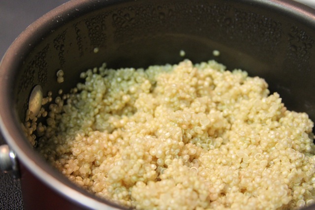 I thought a veggie burger would be great with blueberries, and I decided to use quinoa to give it that extra protein that is sometimes lacking in vegetarian meals. I started the burgers by cooking the quinoa: I boiled 3/4 cup water and then added 1/2 cup quinoa. I cooked it until the water was absorbed, about 12-14 minutes, and set it aside.
