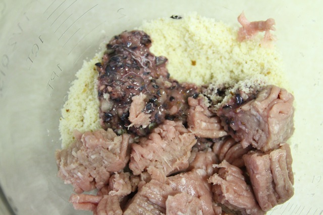 Next, I put the ingredients in the food processor: 1/3 cup fresh blueberries, 1 T apple cider vinegar, 1 tsp Dijon mustard, 1 tsp oyster sauce, 2 cloves minced garlic, a dash of salt, and a dash of pepper. I processed it until it was pureed and then dumped it all into the bowl with the breadcrumbs. I added 1/2 pound ground meat (I used turkey, but you could use beef or whatever you prefer) and mixed everything together. I didn’t have a potato masher, so I used the mixing attachment from my hand mixer.