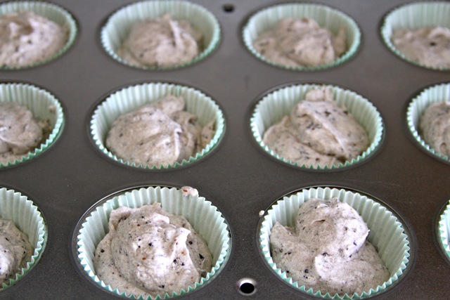 I added half the flour mixture, mixed briefly, added the milk mixture, mixed briefly, and then scraped down the bowl and added the rest of the flour mixture, mixing until just combined. Then I poured the batter into the prepared cupcake tins.