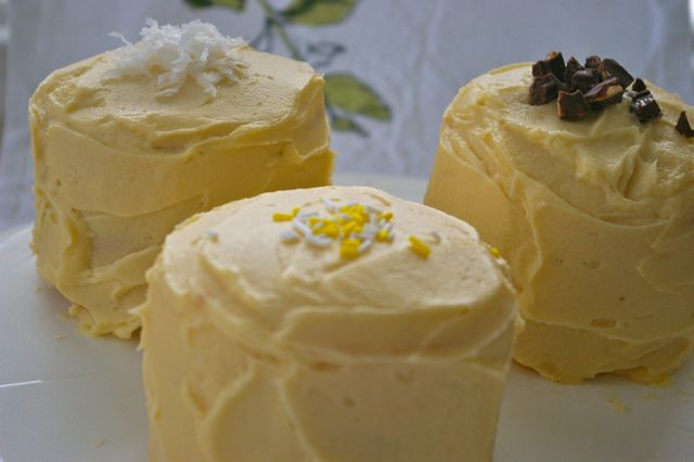 So that the recipient would be able to tell what’s what, I topped each with something to represent what was inside. Coconut flakes on the coconut cake, chocolate bar bits on the almond-chocolate cake, and yellow and white sprinkles on the lemon cake. I stacked them all on one cake tray, and that was that. 1 cake batter 3 ways!