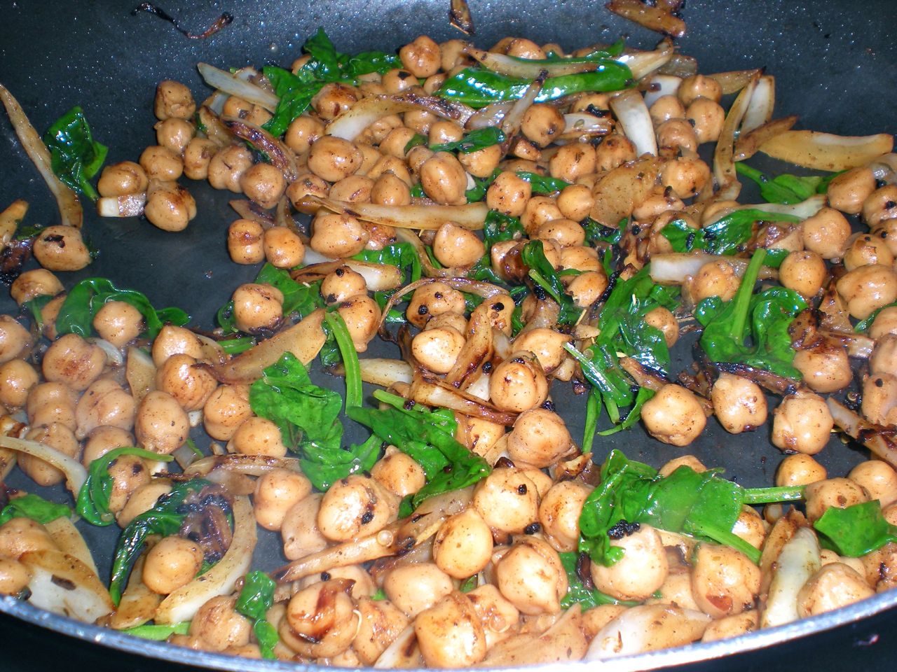 I heated 2 tablespoons olive oil in a large skillet over medium heat. I added 2 cloves minced garlic and 1 fennel bulb, cut into matchsticks (about 1 inch long, 1/4 inch thick). I cooked those about 10-15 minutes. Then I added 1 can (15 oz) drained chickpeas and the juice of half a lime. The original recipe calls for 1/2 teaspoon ground coriander, but I didn’t have any, so instead I added about 1/4 teaspoon “French herb blend” and 1/4 teaspoon lemon garlic blend. But just add whatever you have that sounds good. Last, I finished it off with a couple handfuls of baby spinach. As soon as the spinach cooks down, it’s ready!