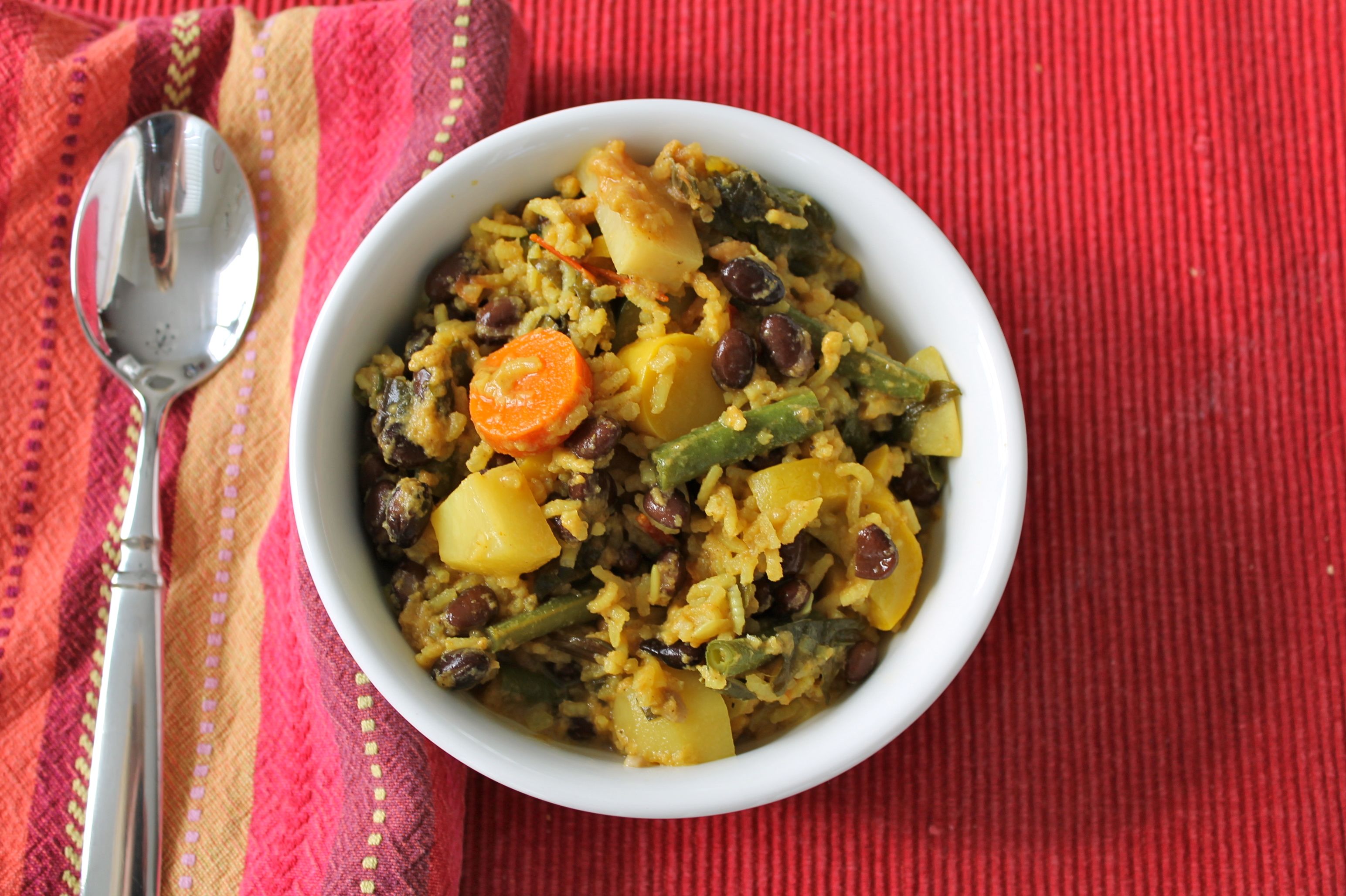 This is a really hearty stew. The rice and beans definitely fill you up. But the coconut curry flavor keeps it light enough to eat year-round. And it’s super healthy too. The coconut and curry flavors are delicious and definitely noticeable, but not so strong that you don’t still taste the vegetables themselves. You definitely want to stick with fresh vegetables, for that reason. Don’t bother with canned or frozen — just use whatever’s fresh in season.