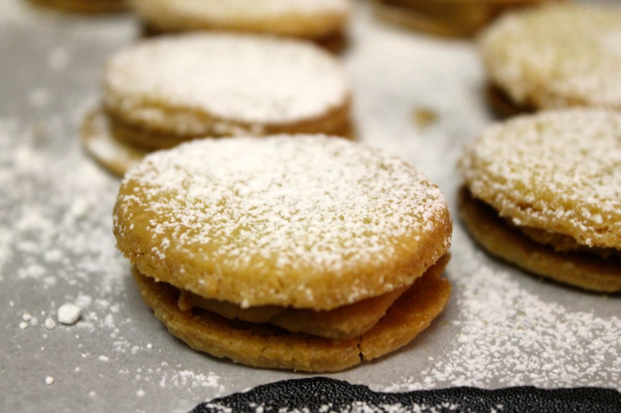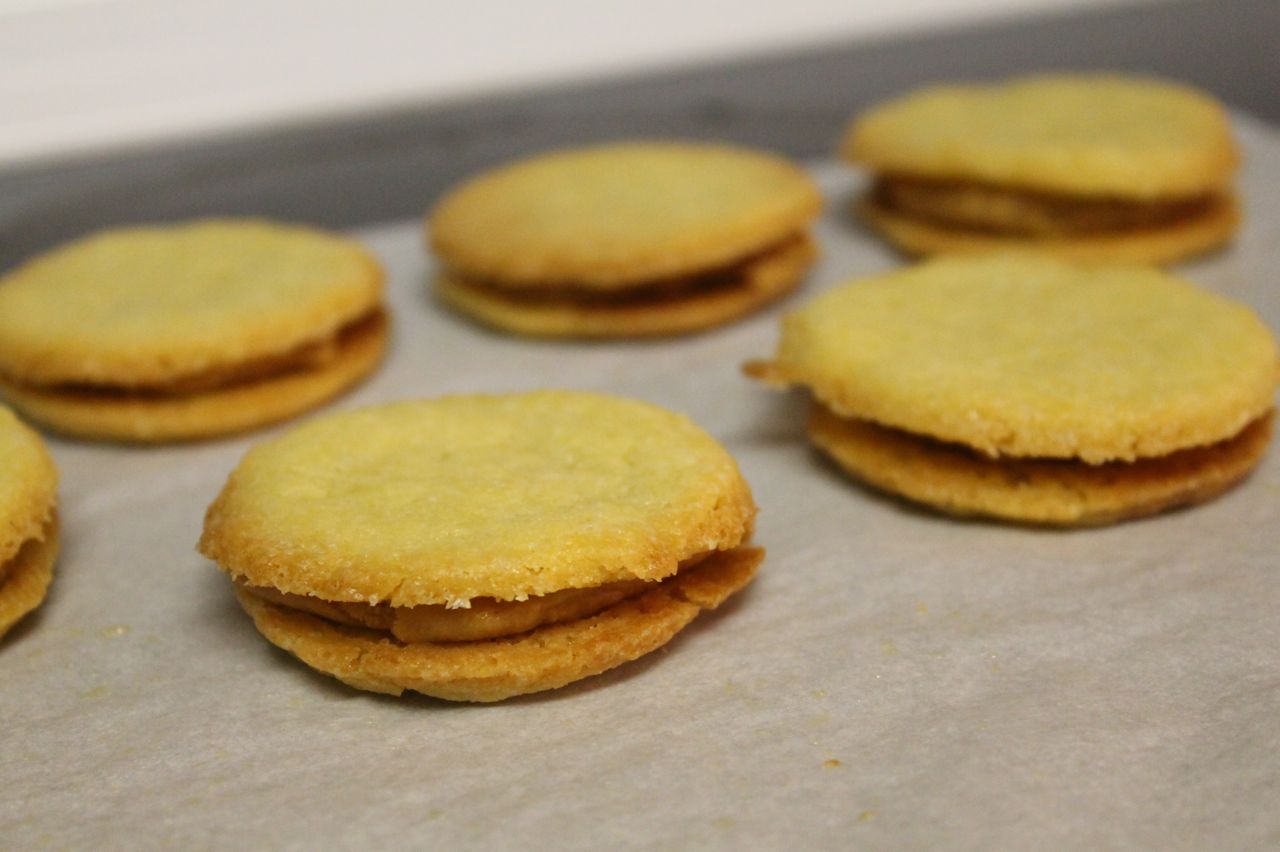 As an expert caramel-maker, Lauren took on that project while I whipped up the cookie dough. Once they were both ready, I rolled out balls of dough and pressed them out, Lauren filled them with a bit of caramel and a dab of Nutella, and I rolled out a second cookie disc to press on top and sandwich it all together. The cookie assembling took quite a while, so I finished up that while Lauren managed the multiple batches of cookies going in and out of the oven. See? Teamwork!