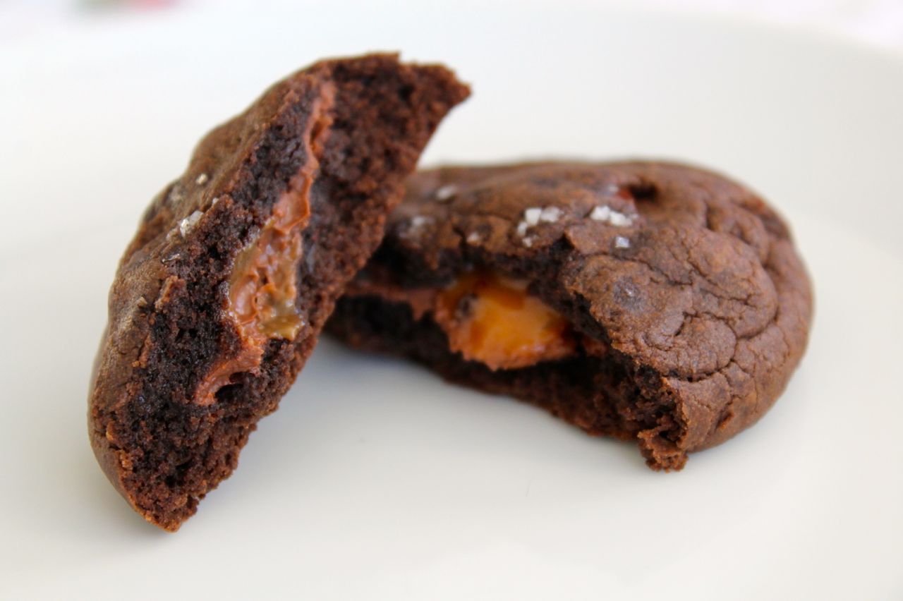 I highly recommend eating these right out of the oven. They’re even gooier and richer and decadent-er. Plus, once they cool, the caramel is a little too tough. In the unlikely scenario that you can’t manage to enjoy the entire batch fresh from the oven and you have a few cookies leftover, just heat them in the microwave for 15-20 seconds before eating so the caramel gets all gooey again.