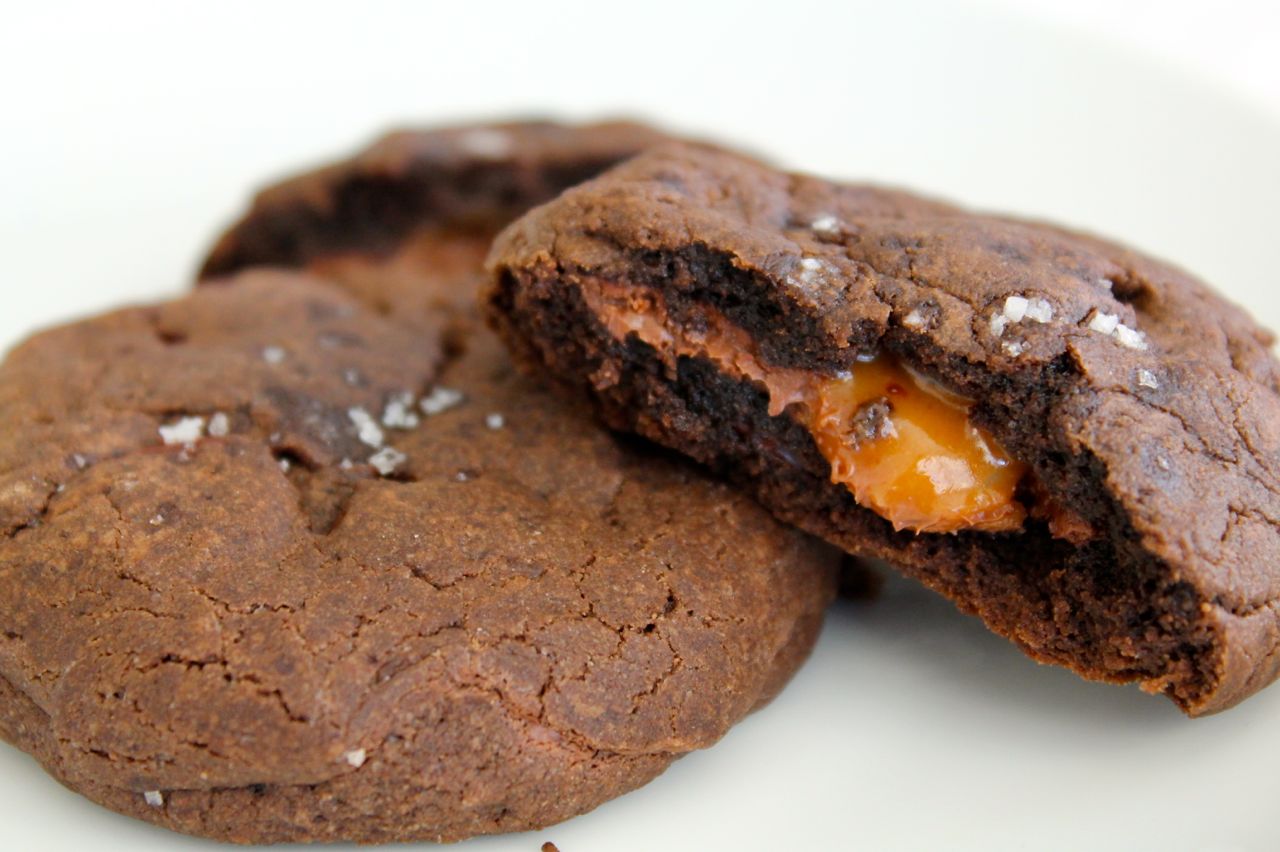 Take 1 heaped tbsp of dough and roll into a fat disc shape. Use your finger make a large indentation the centre of the dough; fill the indentation with a small blob of nutella (like 1/4 tsp ish), and top it up with the still-warm salted caramel (or a caramel-filled chocolate). Top with a flattened tablespoon of dough, and seal the edges. (You may need to dab on a little extra dough to seal the edges.)