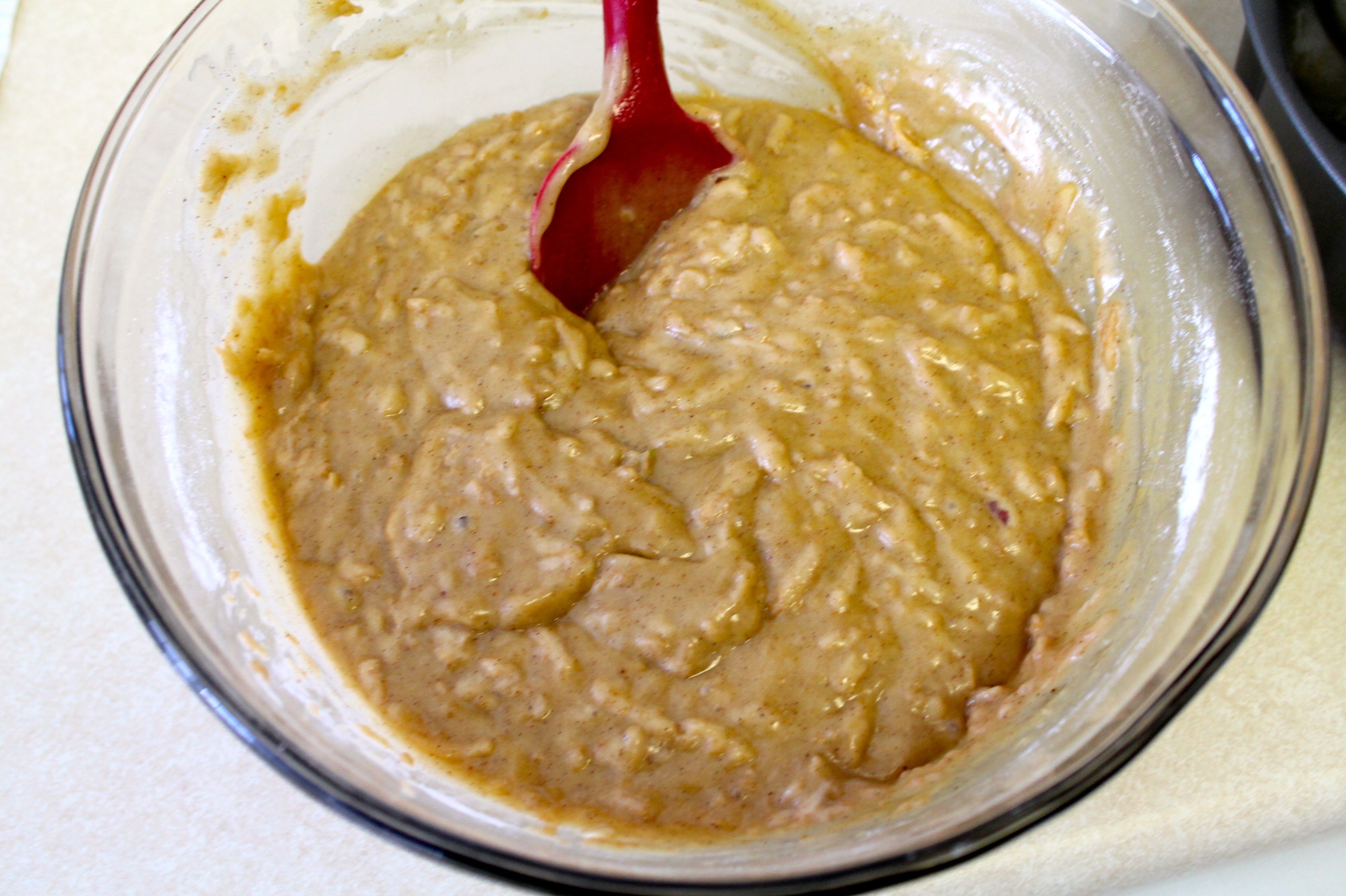 In a separate medium mixing bowl, sift together the flour, baking powder, baking soda, salt, and spices. Incorporate the flour mixture into the liquid, and stir to blend. Fold in the shredded apples.