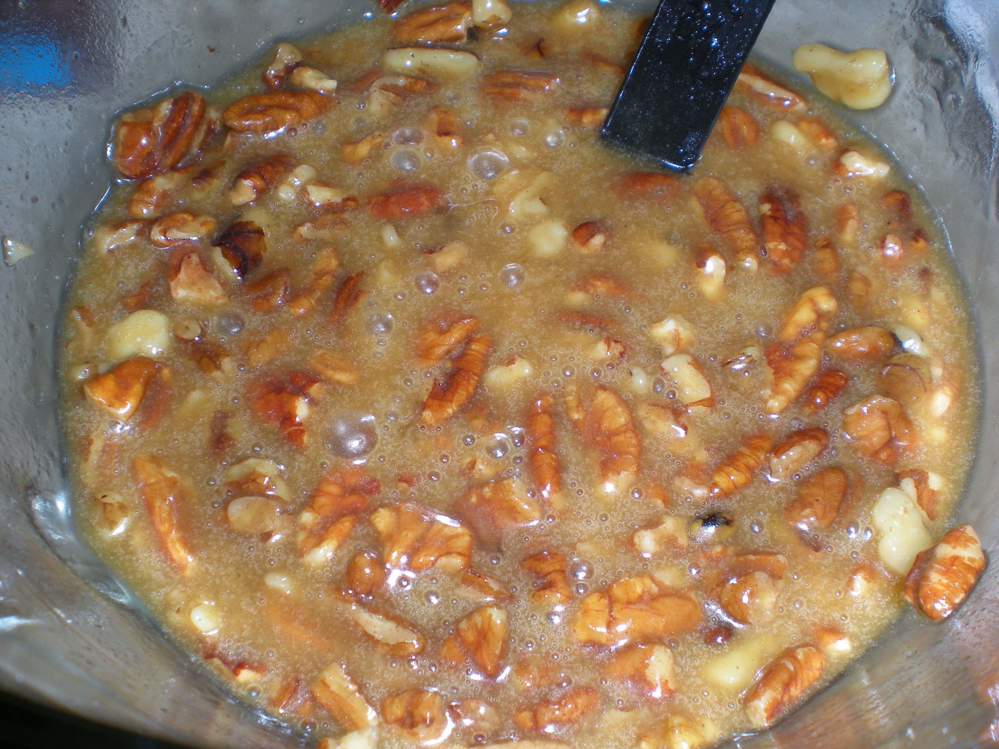 I rolled out 1 refrigerated pie crust into my pie pan and then poured half the brownie batter into it. Then I gently poured the pecan mixture on top of that.